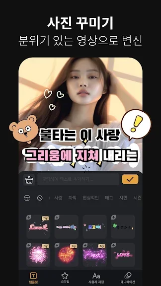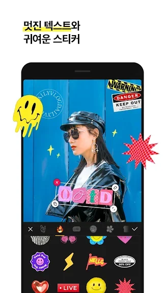 텍스트와 이모티콘 추가 기능으로 영상에 자막을 추가하고, 다양한 글꼴과 이모티콘을 사용할 수 있습니다. 또한 사용자의 휴대폰에 있는 사진을 스티커로 추가하여 동영상에 재미를 더할 수 있습니다.