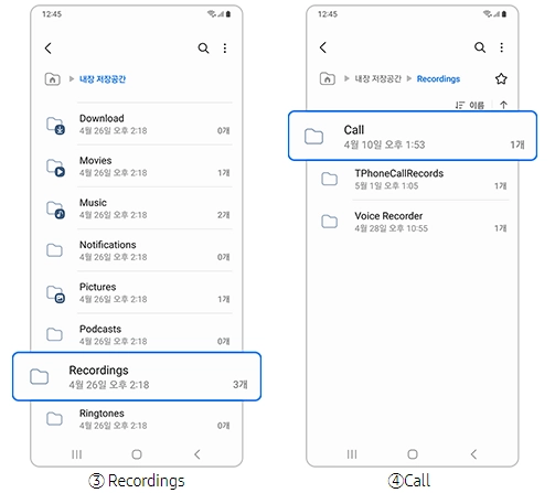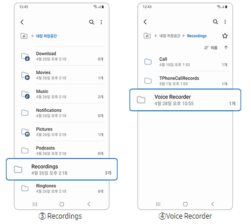 ※ 안드로이드12 OS버전에서는 음성 녹음 및 통화 중 녹음 저장 경로가 변경되었습니다.