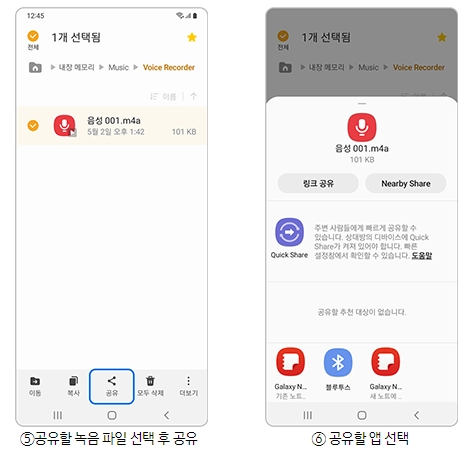 내 파일 앱 실행 > 내장 저장공간 > Recordings > Voice Recorder > 공유할 녹음 파일 선택 후 공유 > 공유할 앱 선택