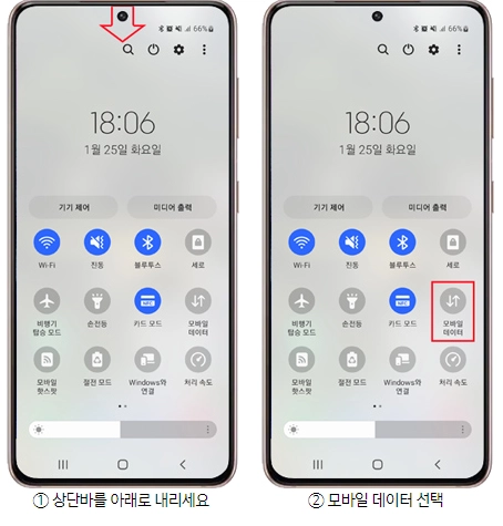 1. 상단 알림창을 아래로 내려 모바일 데이터 버튼을 눌러 켜주세요.