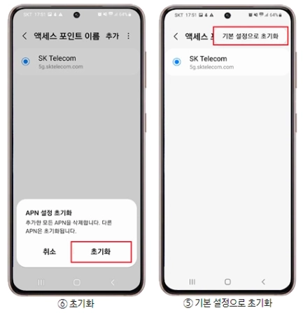 설정 > 연결 > 모바일 네트워크 > 액세스 포인트 이름 > 우측 상단 더보기 > 기본 설정으로 초기화 > 초기화