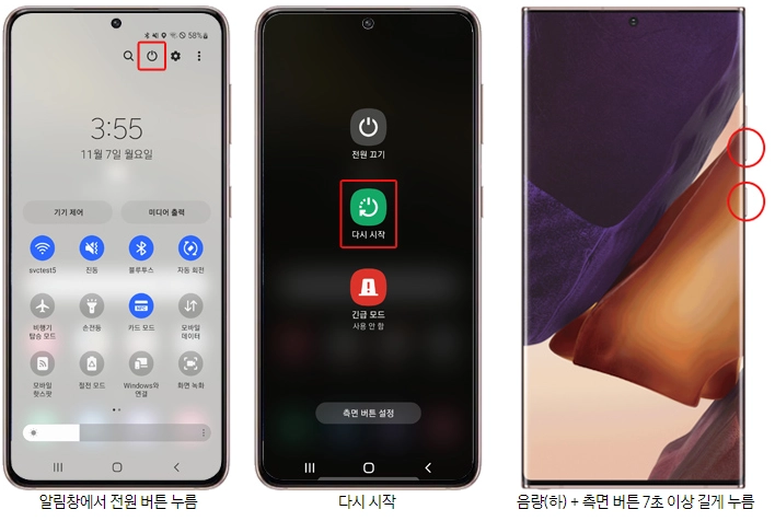 갤럭시 노트10 포함 이후 모델, 다시 시작 방법