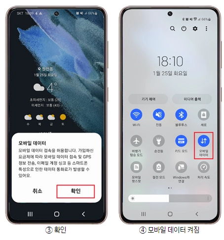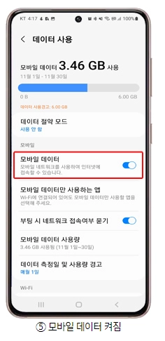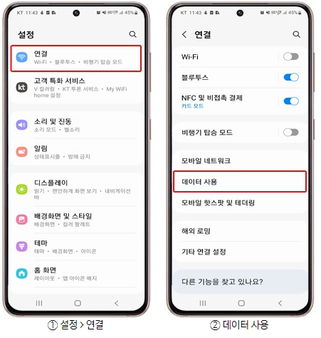 2. 설정 > 연결 > 데이터 사용 > 모바일 데이터 선택 > 켜기 > 확인