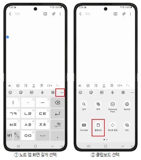 메시지, 카카오톡, 이메일, SNS 등의 키보드 툴바에서 '더보기' → 클립보드→ 클립보드에서 추가할 이미지 또는 글 선택→ 글 입력 창에 선택한 글 표시