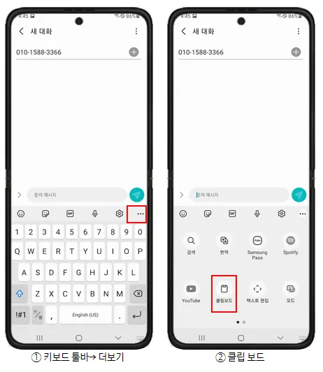 메시지, 카카오톡, 이메일, SNS 등의 키보드 툴바에서 '더보기' → 클립보드→ 클립보드에서 추가할 이미지 또는 글 선택→ 글 입력 창에 선택한 글 표시