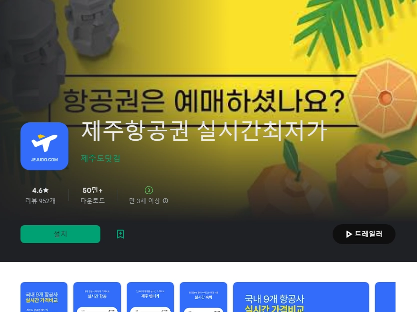 이 어플은 구글플레이스토어에서 "항공권 가격비교"로 검색했을때 2번째로 나오는 어플입니다. 아래는 제주항공권 실시간최저가 어플에 대한 자세한 설명이니 참고하세요.