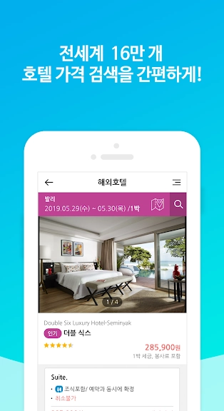 - 호텔 요금, 숙소 위치, 부대시설(Wi-Fi, 수영장, 주차장…) 등 상세한 검색 조건 설정으로 내게 꼭 맞는 숙소를 찾아보세요.