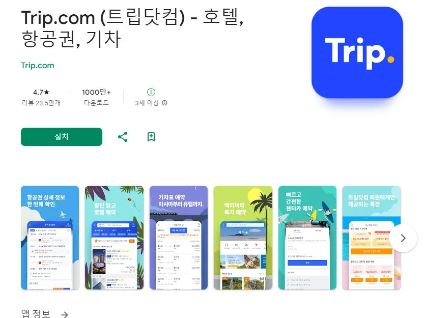 이 어플은 구글플레이스토어에서 "최저가 항공권"로 검색했을때 5번째로 나오는 어플입니다. 아래는 Trip.com (트립닷컴) - 호텔, 항공권, 기차 어플에 대한 자세한 설명이니 참고하세요.