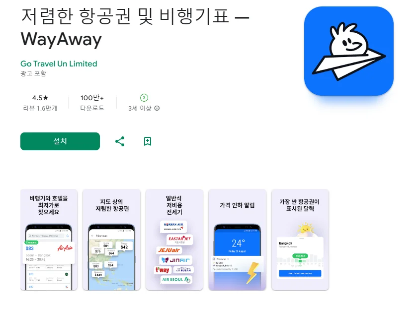 이 어플은 구글플레이스토어에서 "최저가 항공권"로 검색했을때 4번째로 나오는 어플입니다. 아래는 저렴한 항공권 및 비행기표 — WayAway 어플에 대한 자세한 설명이니 참고하세요.