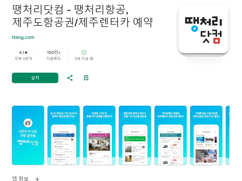 이 어플은 구글플레이스토어에서 "최저가 항공권"로 검색했을때 3번째로 나오는 어플입니다. 아래는 땡처리닷컴 - 땡처리항공, 제주도항공권/제주렌터카 예약 어플에 대한 자세한 설명이니 참고하세요.
