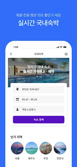 - 국내숙박 회원가 평균 15% 할인