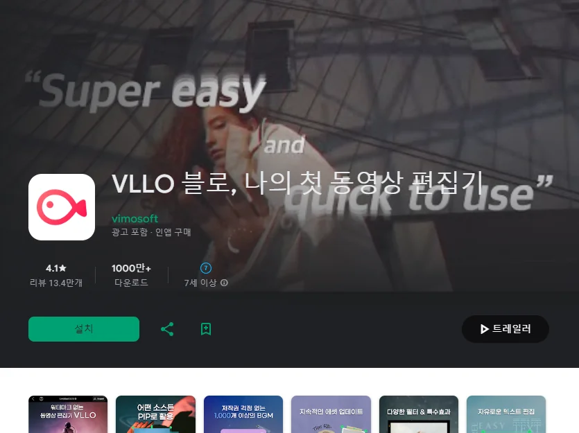 이 어플은 구글플레이스토어에서 "동영상 편집"로 검색했을때 3번째로 나오는 어플입니다. 아래는 VLLO 블로, 나의 첫 동영상 편집기 어플에 대한 자세한 설명이니 참고하세요.
