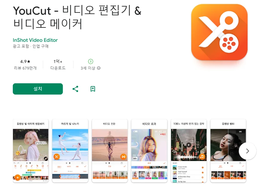 이 어플은 구글플레이스토어에서 "동영상 편집"로 검색했을때 1번째로 나오는 어플입니다. 아래는 YouCut - 비디오 편집기 & 비디오 메이커 어플에 대한 자세한 설명이니 참고하세요.