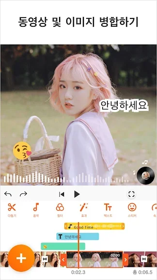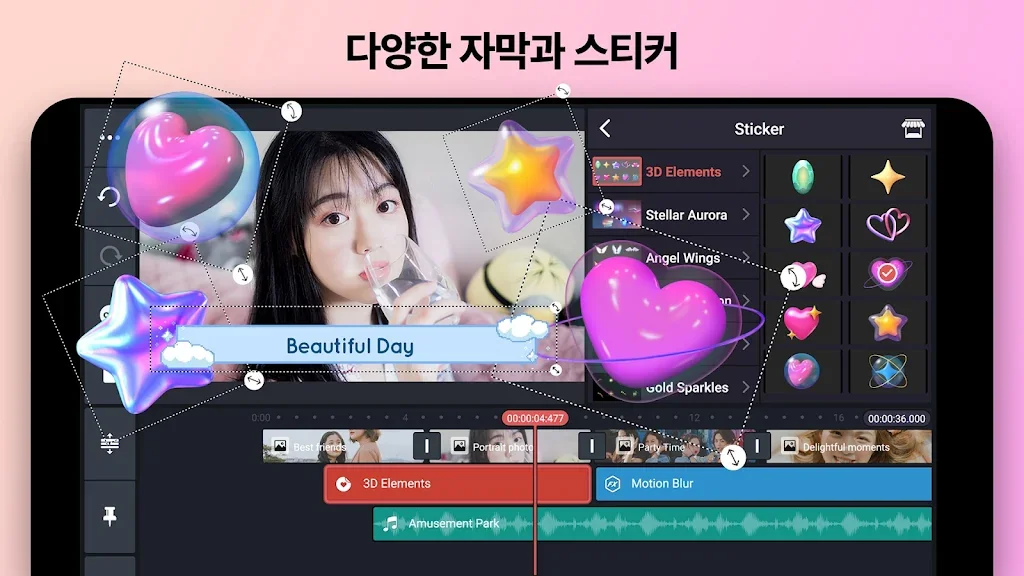 컷분할, 자막, 스티커, 배경음악, 효과음 및 트랜지션 등을 사용해 자유롭게 원하는 영상을 연출해보세요.