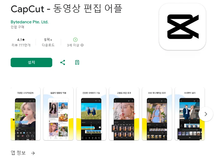 이 어플은 구글플레이스토어에서 "동영상 편집"로 검색했을때 2번째로 나오는 어플입니다. 아래는 CapCut - 동영상 편집 어플 어플에 대한 자세한 설명이니 참고하세요.