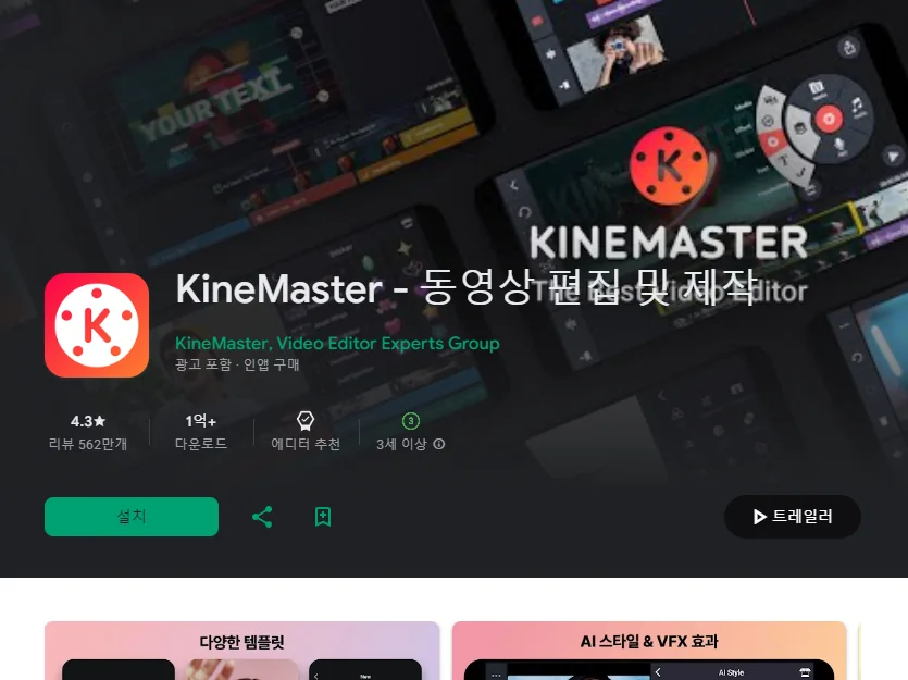이 어플은 구글플레이스토어에서 "동영상 편집"로 검색했을때 5번째로 나오는 어플입니다. 아래는 KineMaster - 동영상 편집 및 제작 어플에 대한 자세한 설명이니 참고하세요.