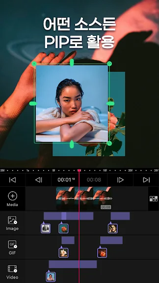 - PIP (Picture-in-Picture). 클립 위에 동영상 및 사진 레이어를 추가합니다.