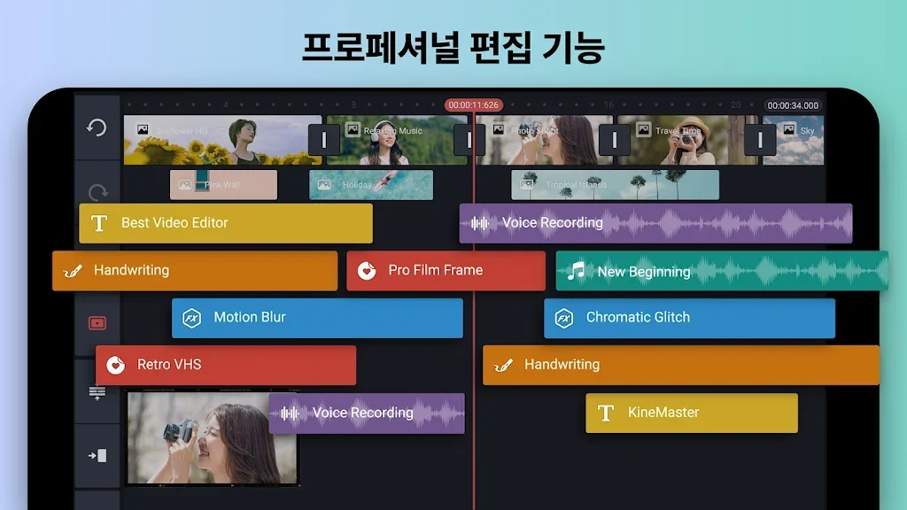 키프레임 애니메이션, 크로마키(그린 스크린), 속도 제어(슬로우 모션, 타임 랩스), 배경 제거(AI 누끼) 등의 고급 비디오 편집 기능을 제공하는 KineMaster야말로 동영상 편집, 뮤직 비디오 편집, 브이로그 편집, 애니메이션 제작을 원하는 분들에게 최고의 선택이 될 것입니다.