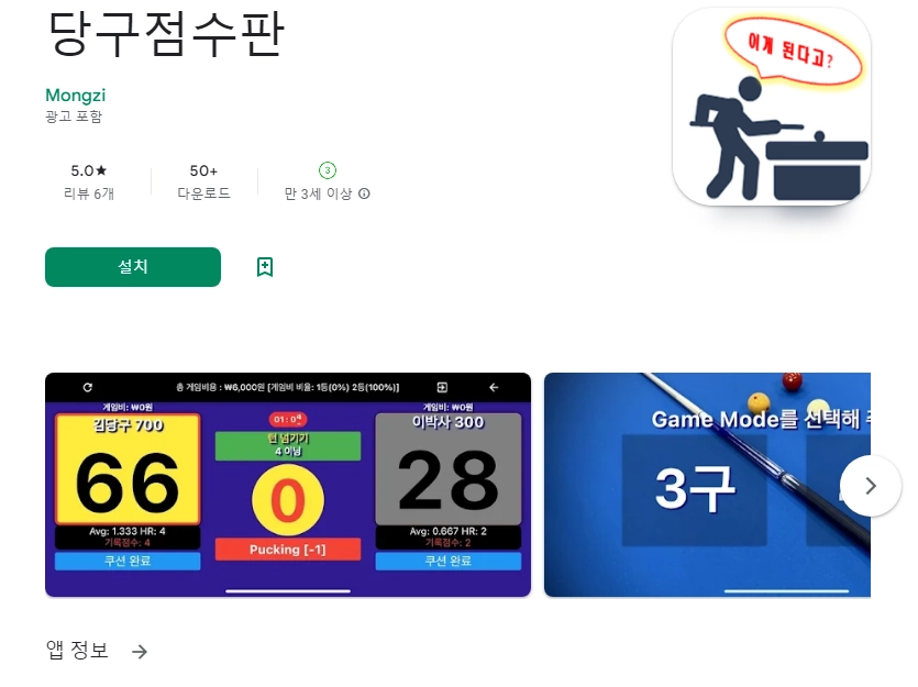 아래는 당구점수판 어플에 대한 스크린샷 정보입니다.