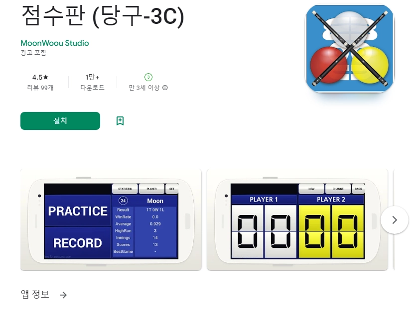 이 어플은 구글플레이스토어에서 "스마트폰 당구 점수판"로 검색했을때 3번째로 나오는 어플입니다. 아래는 점수판 (당구-3C) 어플에 대한 자세한 설명이니 참고하세요.