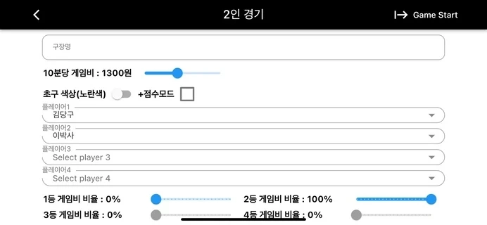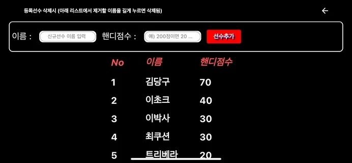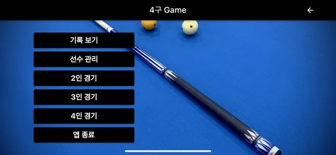 ▶ 좋습니다. 아쉬운점은 기록게임이 아닌 게임에서 선수1, 2 대신에 그자리에 이름을 넣을수 있으면 좋겠습니다. 3구경기도 마이너스가 되면좋겠습니다 동네당구장에서하는것처럼이요 기록게임도 4인이 있으면 좋겠습니다