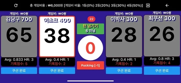 ▶ 4구할때 잘 쓰고 있는데요 수지가 다른 사람이 칠때 예를들어 150vs200이면 플레이어별로 한계선이 정해져있었으면 좋겠구요. 쿠션개수도 추가해서 알다마 다 빼면 자동으로 쿠션들어가게끔 개발해주셨으면 합니다 그 외에는 디자인도 직관적이고 당구장점수판대신 스마트폰으로 잘 쓰고있와요!