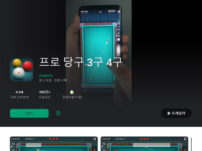 아래는 프로 당구 3구 4구 어플에 대한 스크린샷 정보입니다.
