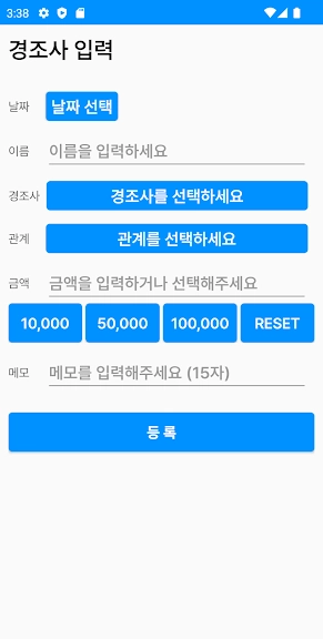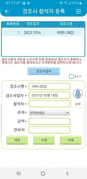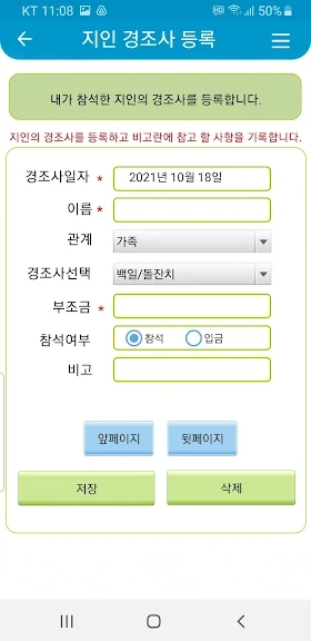 경조사관리 어플에 대한 스크린샷 정보가 필요하시다면 아래 이미지를 참고하시기 바랍니다.