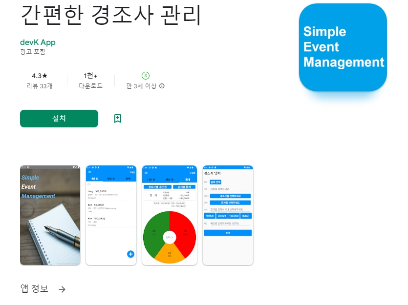 이 어플은 구글플레이스토어에서 "모바일 경조사 관리"로 검색했을때 2번째로 나오는 어플입니다. 아래는 간편한 경조사 관리 어플에 대한 자세한 설명이니 참고하세요.