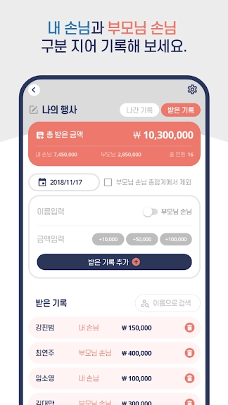 - 매번 얼마나 받았는지 봉투를 찾아서 또는 장부를 들춰볼 필요 없이 핸드폰으로 쉽게 확인할 수 있습니다.