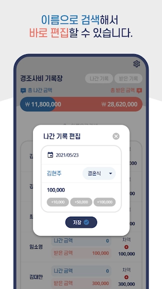 - 경조사 이름, 사람과의 관계도 손쉽게 추가, 삭제, 수정할 수 있습니다.