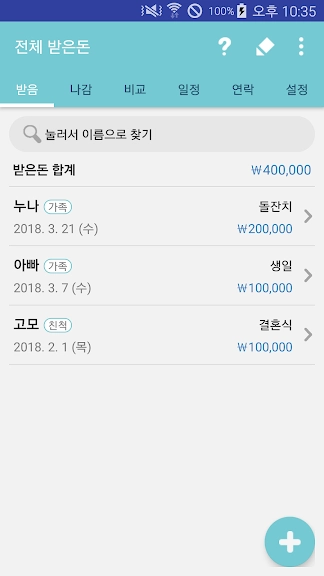 ▶ 다른거 쓰다가 폰 바꾸면서 새로 설치했는데 좋아요. 아쉬운 건 받은것도 나간것처럼 날짜 정렬되거나 결혼, 장례 등 항목을 바로 설정할 수 있으면 좋겠어요. 받은항목 제목을 수정할 수 있으면 더 좋을 것 같아요. 항목별 받은 날짜도 다를 수 있으니까 폴더 정리처럼 (결혼식 안에 날짜를 다르게 설정할 수 있다거나 하는.....)