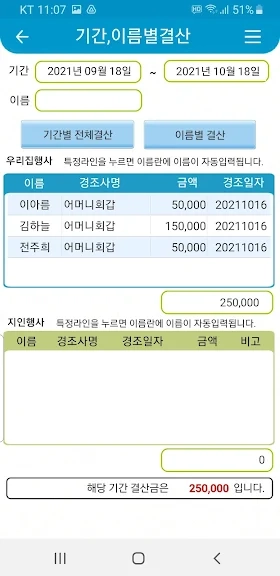 경조사별결산, 지인,기간별 결산이 가능합니다.