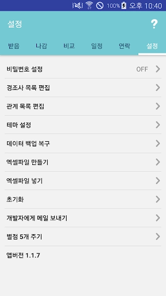 ▶ 어플 굉장히 깔끔하고 사용법도 간단해서 좋아요. 다만 다른 분들도 지적해주셨듯이 정렬(이름순, 날짜순 등) 기능이랑 엑셀파일 만들기, 이메일로 내보내기, 전화번호 등록 및 문자 발송 등이 가능하면 좋겠습니다.